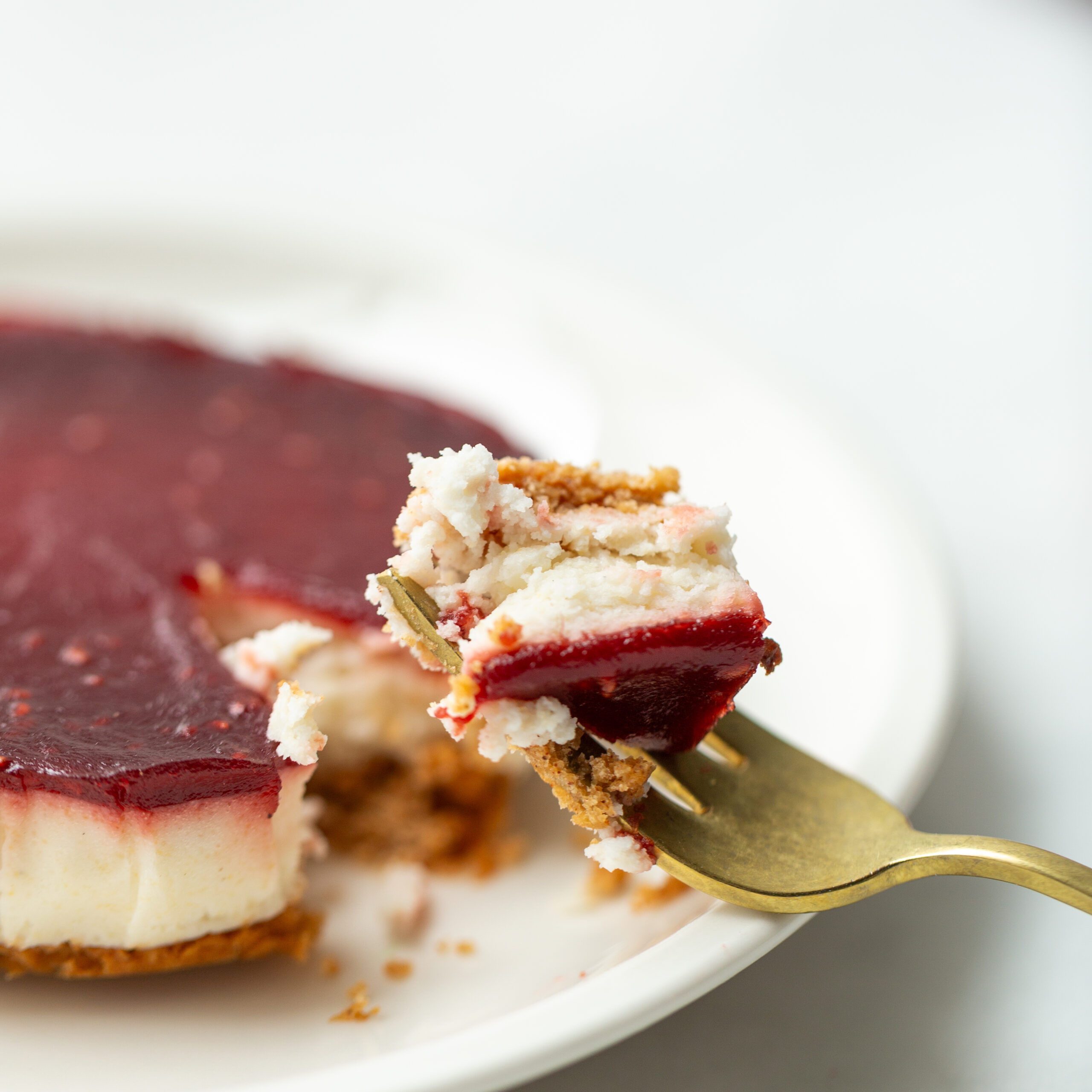 Dit gluten- en lactosevrije gebakje bestaat uit cheesecake met framboos en aardbei.